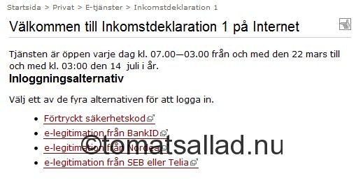 Men nu har jag ju inte tid. För jag måste deklarera. Deklarera är normalt rätt lätt. Man loggar in på Skatteverket och så fyller man i en och annan siffra och så tjong så fixas allt automatiskt. Svisch svosch. Man lägger mer tid på att oja sig för det hela än det egentligen tar. Men det förutsätter alltså att man kommer in på skatteverkets sida. Och det är lättare sagt än gjort. De erbjuder massa olika alternativ men jag som är kund i SEB får hålla till godo med Telias e-leg. Och vem som har stollat till det systemet det vet jag inte.