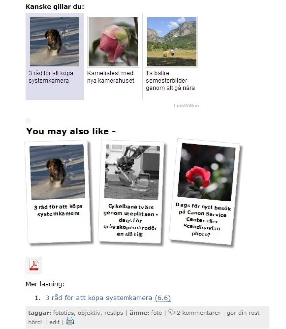 Jag har bytt läs mer-plugg här på Tomatsallad. Slängt ut LinkWithin och installerat nRelate istället. Och vad var då vitsen med detta? Tja jag hoppas att den nya är bättre. Men först och främst kanske jag ska förklara varför man har en läs mer eller relaterade inlägg- plugg (ni som tycker detta är gammal skåpmat kan raskt hoppa vidare till nästa rubrik). Syftet är att få fler läsare genom att underlätta för dem att hitta mer att läsa i samma ämnesområde. Om en ny läsare har hittat hit genom att googla efter bra objektiv för resan så ska han eller hon i slutet bli föreslagen andra texter som handlar om objektiv eller fotografering. Har besökaren istället sökt efter vad jag tycker om kommunikation på byggarbetsplatser ska länkar till den typen av artiklar visas (och inte tvärtom). Besökaren får intressanta texter serverade vilket gör att de stannar kvar längre och läser mer. Trevligt för er läsare och roligt för mitt ego. Men det förbättrar också sidans statistik vilket i sin tur google tolkar som att sidan är läsvärd. Och då rankas sidan högre, fler hittar hit och ju fler som hittar hit ju fler kan jag berätta om mina böcker för osv.