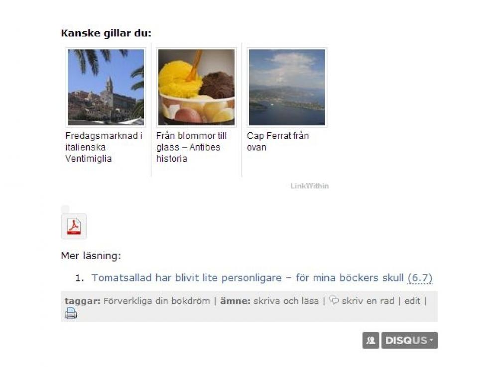 Jag har haft två tillägg som visat läs mer-länkar installerade i evigheter, LinkWithin och YARPP (Yet Another Related Post Plugin). Orsaken att jag har haft två är för att den ena har varit snygg och den andra exakt. LinkWithin har bara en inställning och det är antal bilder som ska visas. Det har sett elegant ut men ofta har länkarna varit allt annat än relevanta. Det här skärmklippet är från mitt senaste inlägg som handlar om hur jag fotat boken Förverkliga din bokdröm Det är publicerat i kategorin läsa och skriva samt taggad med Förverkliga din bokdröm. LinkWithin har valt ut tre inlägg från franska Rivieran som relevant vidareläsning. Ingen vidare ämnesmässig överlappning tycker jag.
