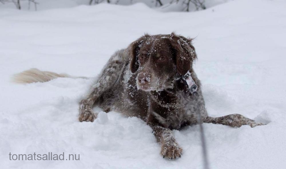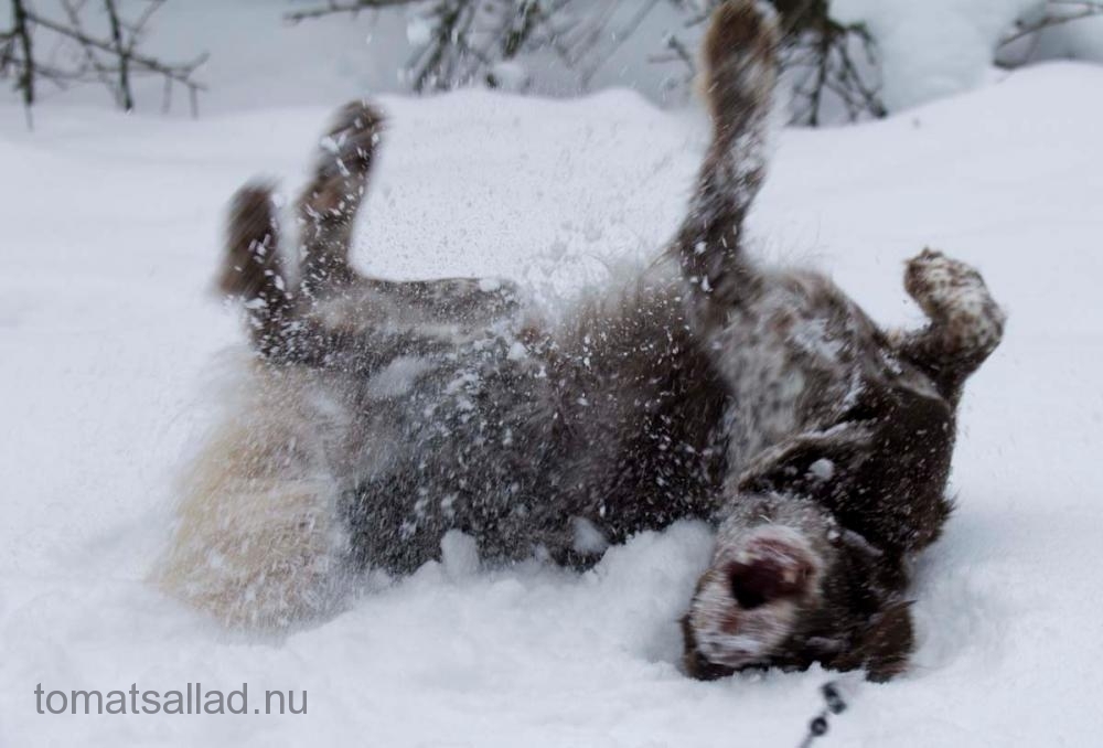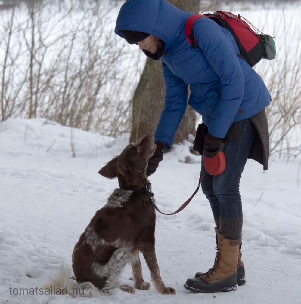 Lägg till en sjö och en ficka med hundgodis så kommer alla att bli lyckliga. Människorna som får umgås i vackra omgivningar och hunden som får snosa på många snödrivor. Hunden visar sin lycka på ett mycket uttrycksfullt sätt vilket gör människorna på ännu bättre humör. Fickan med hundgodis förbättrar hundens hörsel för kommandon. Alla lyckliga. Upprepas lämpligen dagligen. Bieffekter inkluderar bättre kondis.
