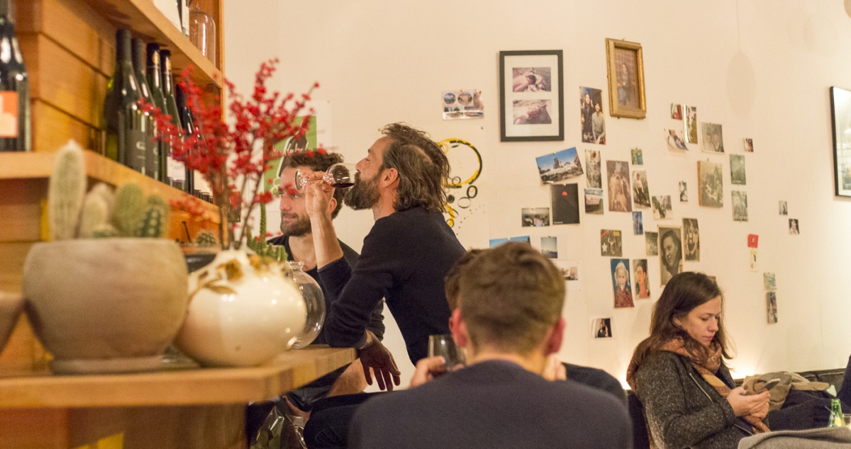 Ingången är i hörnet av det trekantiga huset. Ena väggen täcks av stora fönster ut mot gatan, längs den andra långväggen finns köket inrymt bakom hyllor med vinflaskor. Besökarna kan välja mellan små runda bord eller en barstol. På golvet bredvid en barstol såg jag en vinkartong märkt Pouilly Fume.