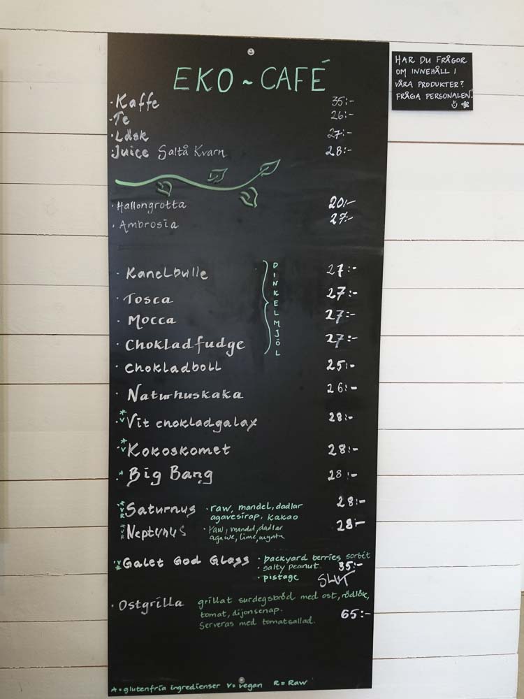 Helgen innan praktiserade jag detta genom Härjedalen och Hälsingland med effekt att första lunchförsöket blev ett knäckrån och nästa en fjällko-ostkaka. Nu hade jag bespetsat mig på något lite mer mataktigt men utbudet av icke-söta saker begränsades till en grillad ostsmörgås. Den söta avdelningen var större och jag funderade på om jag skulle vara en duktig reseguidesskribent och lassa på ett gäng kakor med utgångspunkt vilka som gör sig bäst på bild, eller äta en macka. Jag valde mackan (65 kr) och en rawboll.