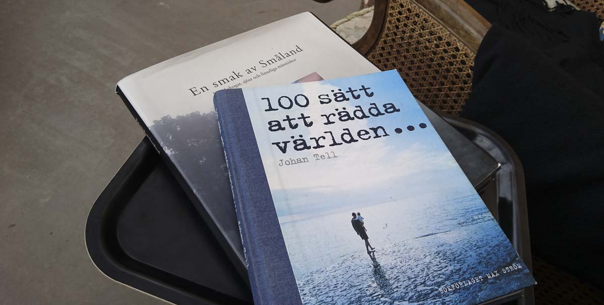 Det får i så fall göras utan hund eller datorer som ej är välkomna. Istället finns ett antal begagnade böcker att bläddra i. De hade miljöprofil eller handlade om Småland. I Johan Tells 100 sätt att rädda världen hittade jag följande under tips att klä sig grönare, det vill säga undvika friluftskläder impregnerade med flourkemikalier.