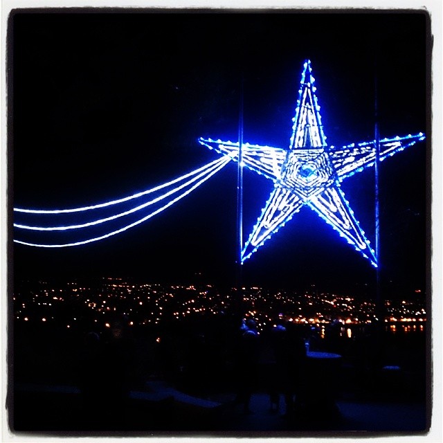 Så här såg det ut vid fyren La Garoupe ett par minuter före tolvslaget i natt. Ett antal personer hade samlats där uppe för att se alla fyrverkerier längs kusten samt skåla in det nya året.