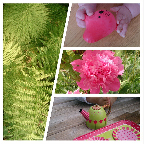 Den första ormbunken kvalade in mest för den skira ljusgröna färgens skull som matchade övriga bilder så bra i det här collaget. Fötterna som anas i nedre bilden tillhör Miss E som serverar kaffe i sin fina kanna. De härligt knubbiga fingrarna som håller i ballongen är Tossens.